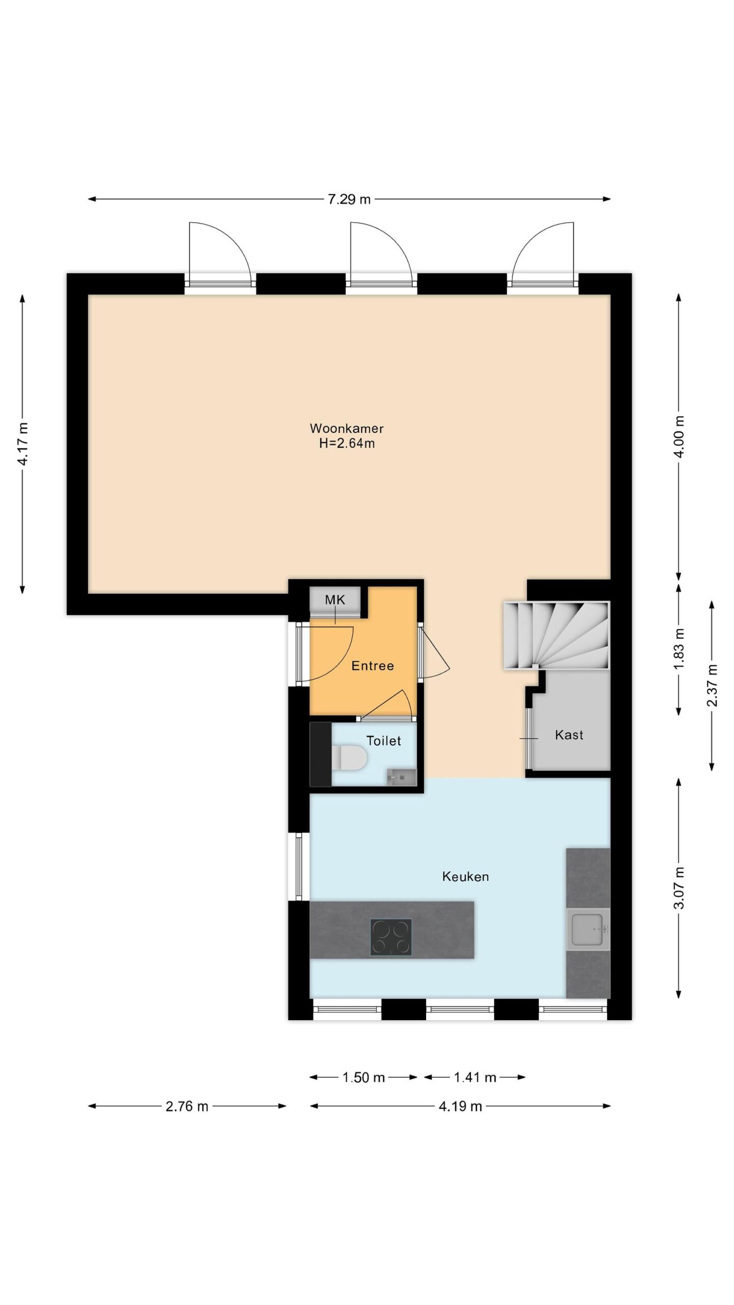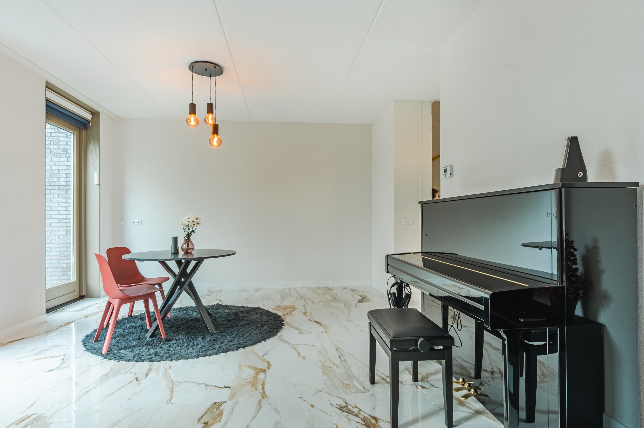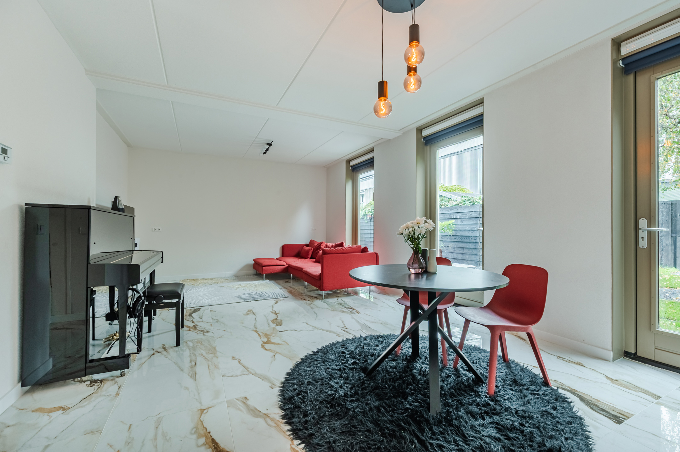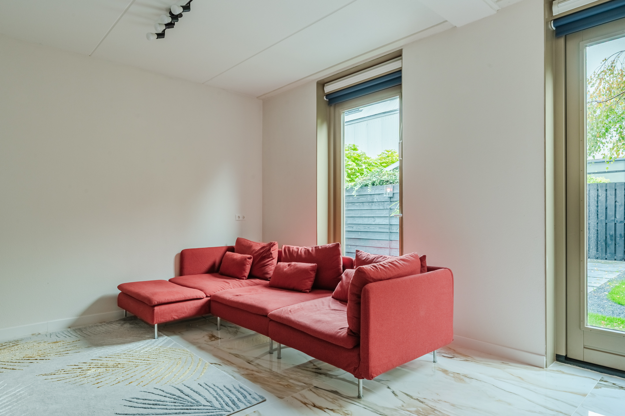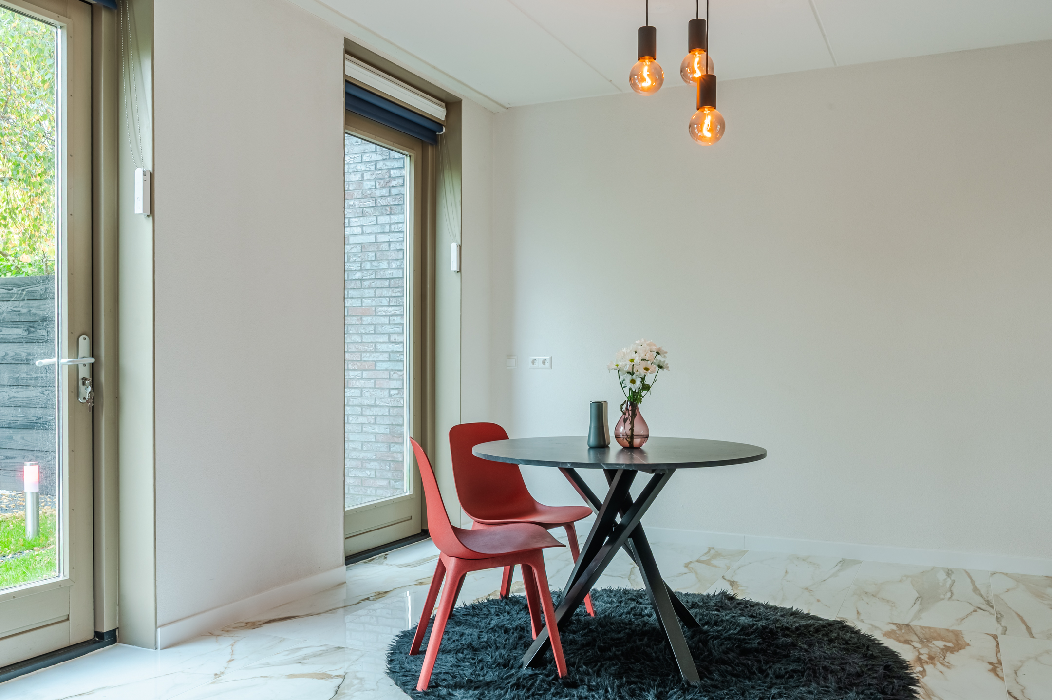 De lichte woonkamer is tuingericht en maar liefst 7,29 meter breed. 3 grote ramen laten een prettige hoeveelheid lichtinval naar binnen en kunnen ook allemaal als deur naar de tuin gebruikt worden.