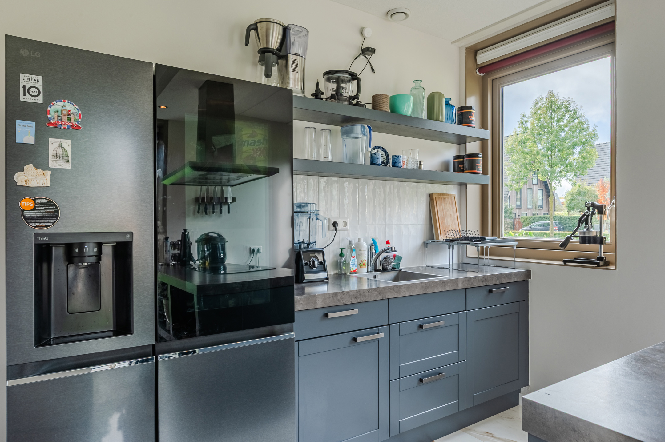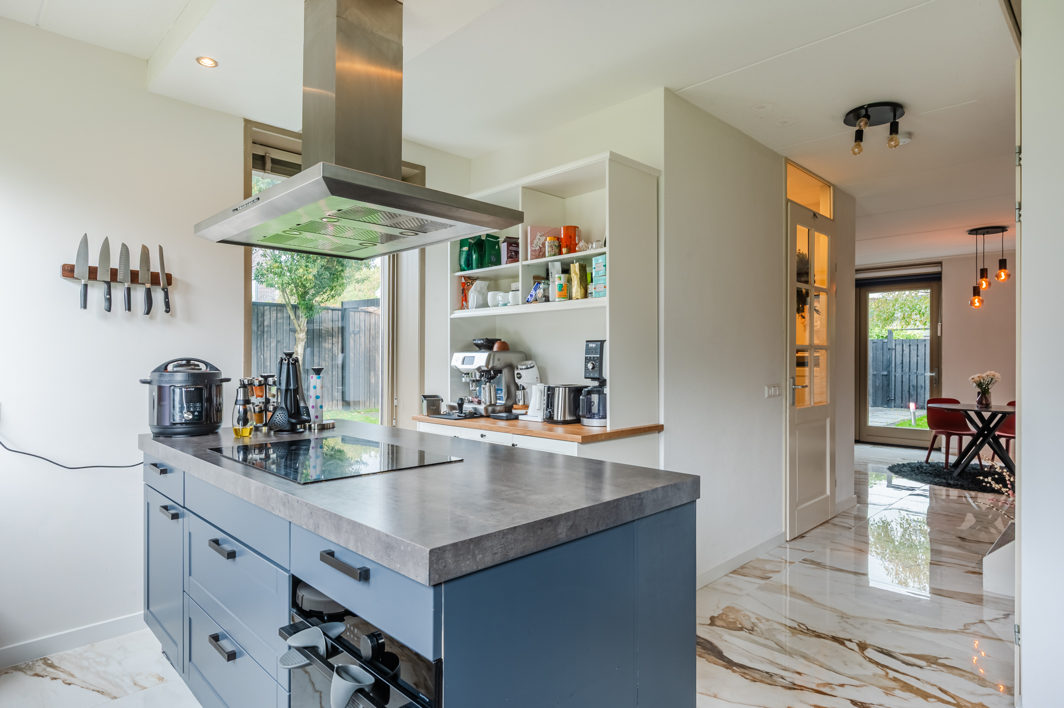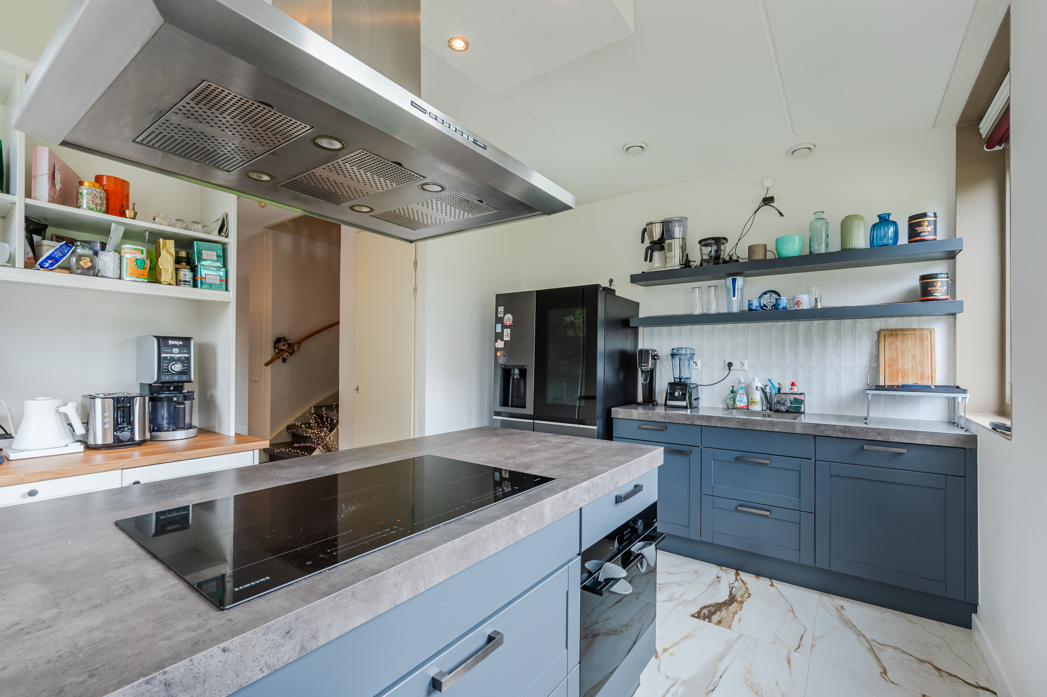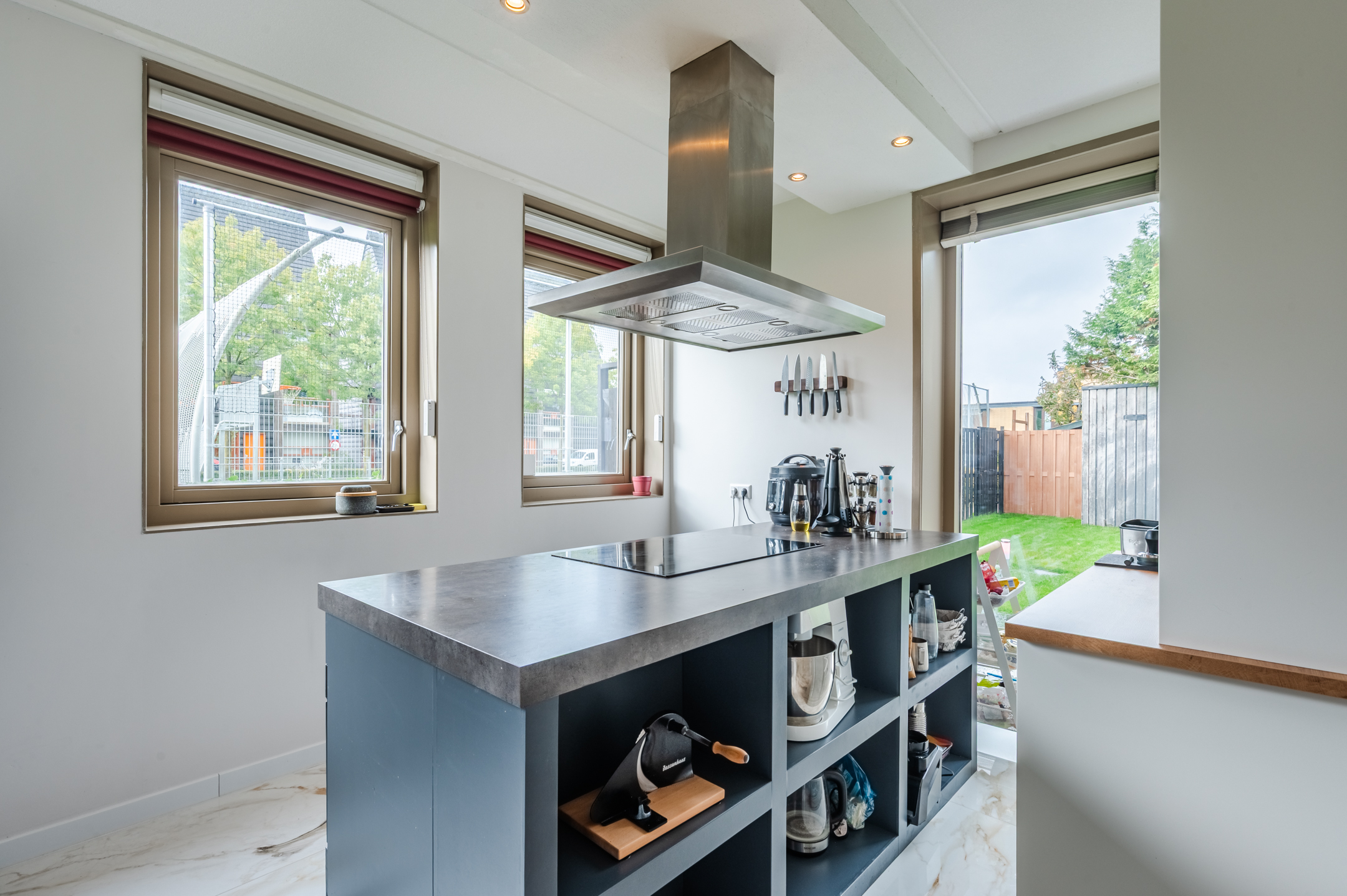 De open leefkeuken met kookeiland is voorzien van een inductiekookplaat, oven, stoomoven, magnetron, koelkast, vriezer en een vaatwasser.