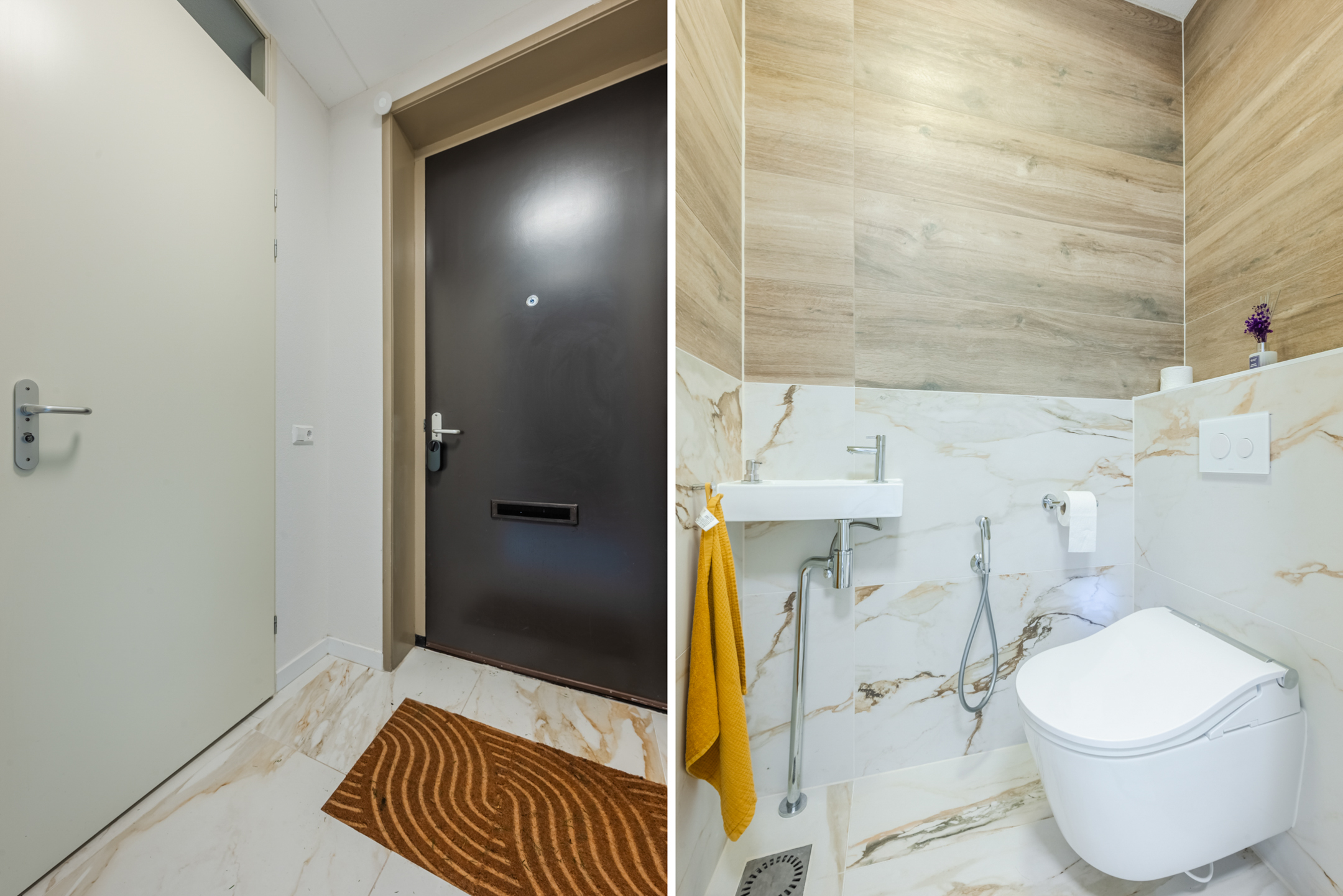 Achter de voordeur vinden we de entreehal met de meterkast, het gastentoilet met fonteintje en de toegang tot de woonkamer met open keuken.