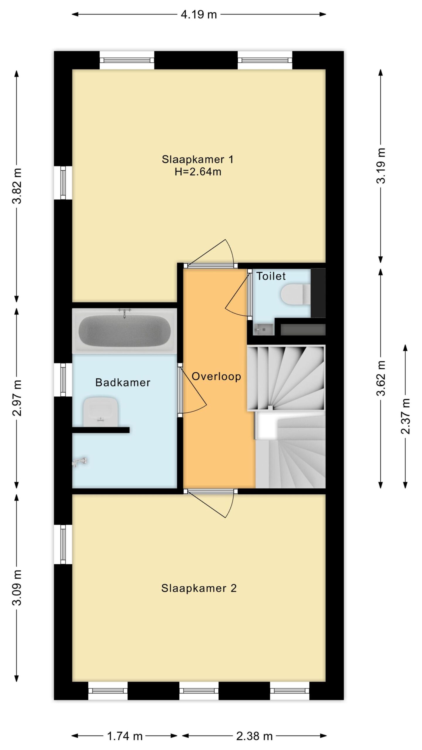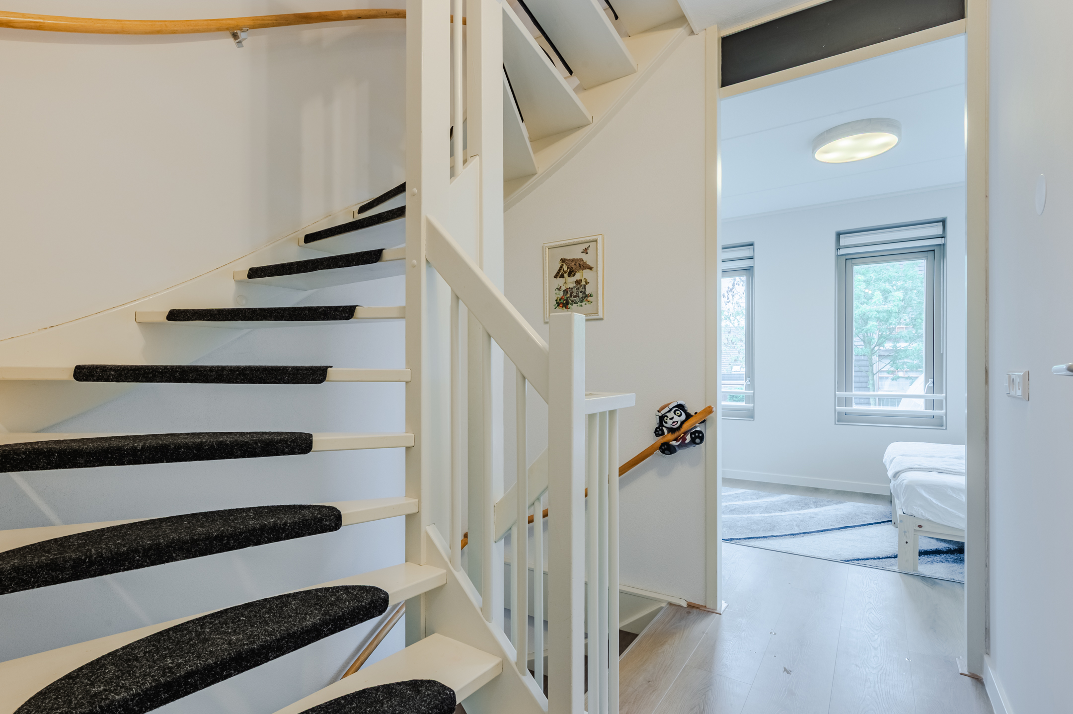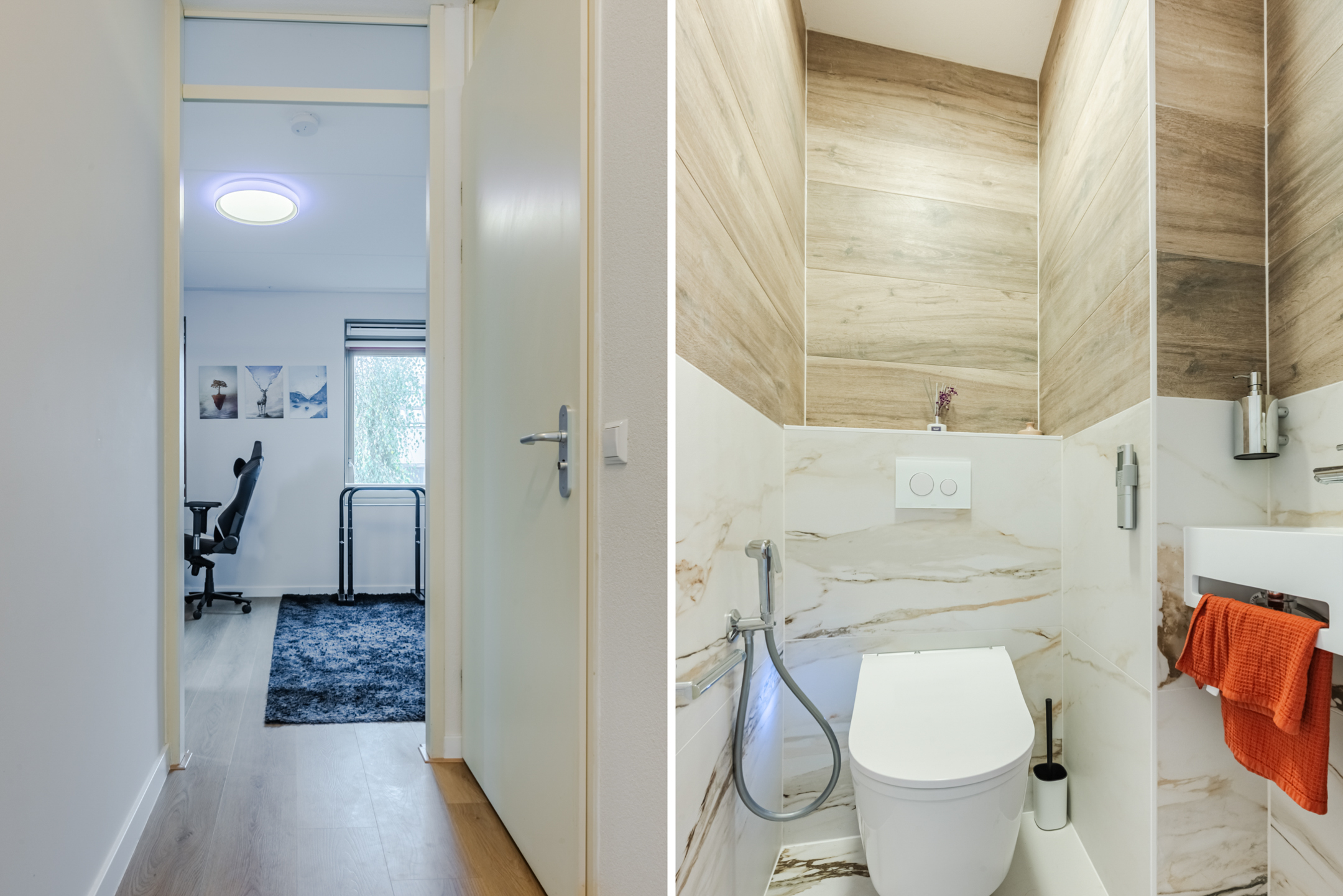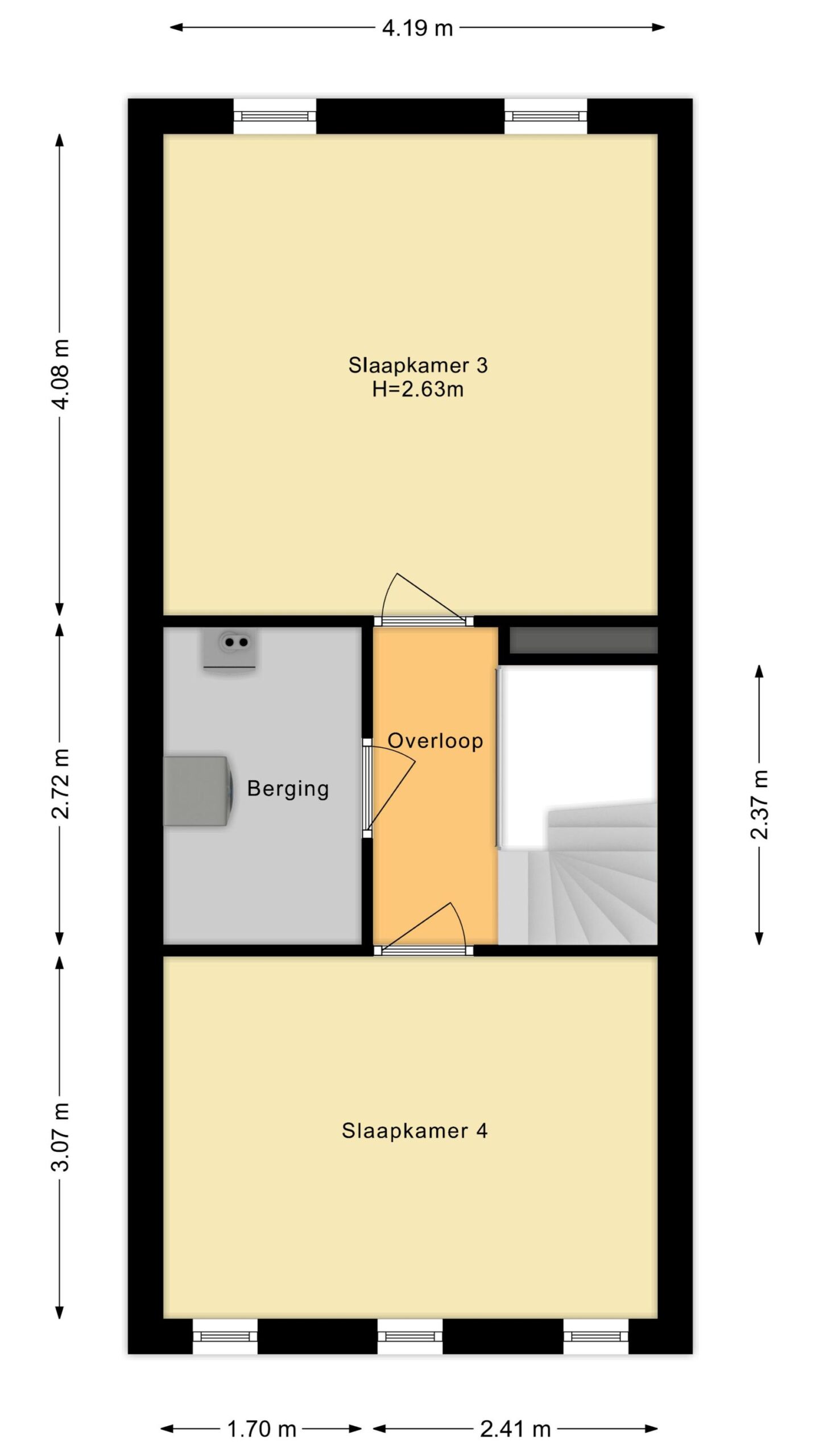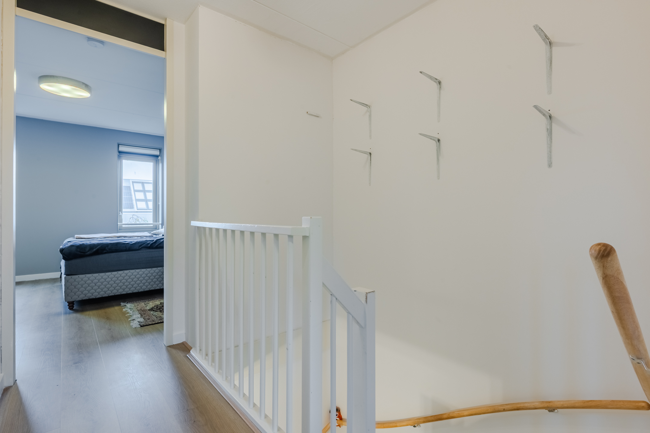 Via de vaste trap op de eerste verdieping bereiken we de ruime tweede verdieping met overloop, aparte wasruimte/berging en nog eens 2 volwaardige slaapkamers.