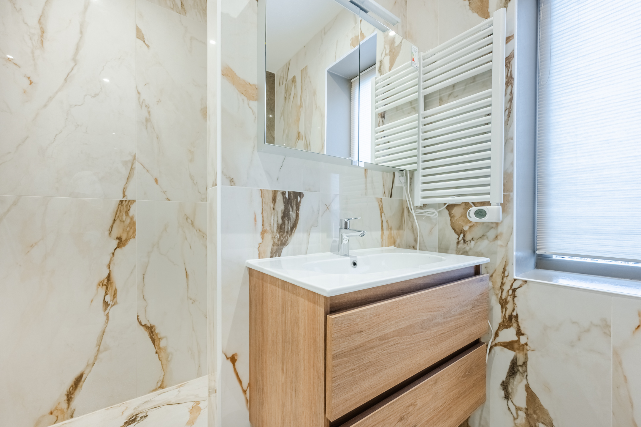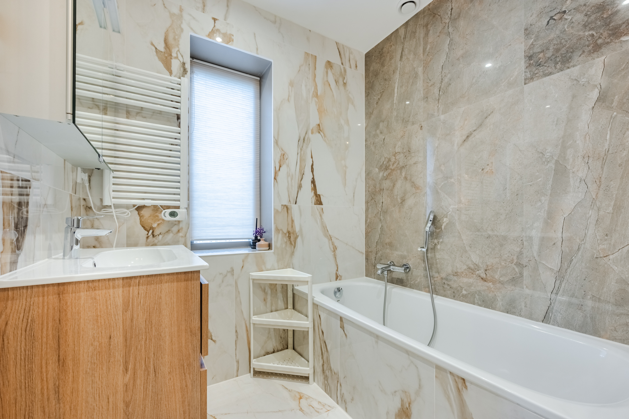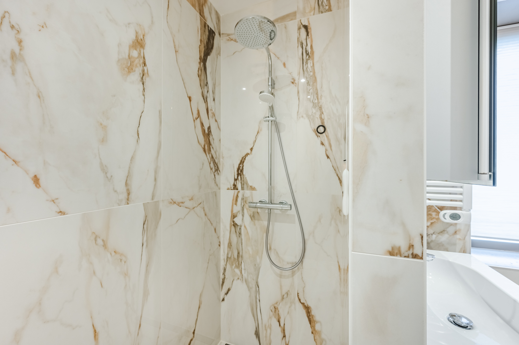 Er is sprake van een nette afwerking met een tegelvloer met vloerverwarming.