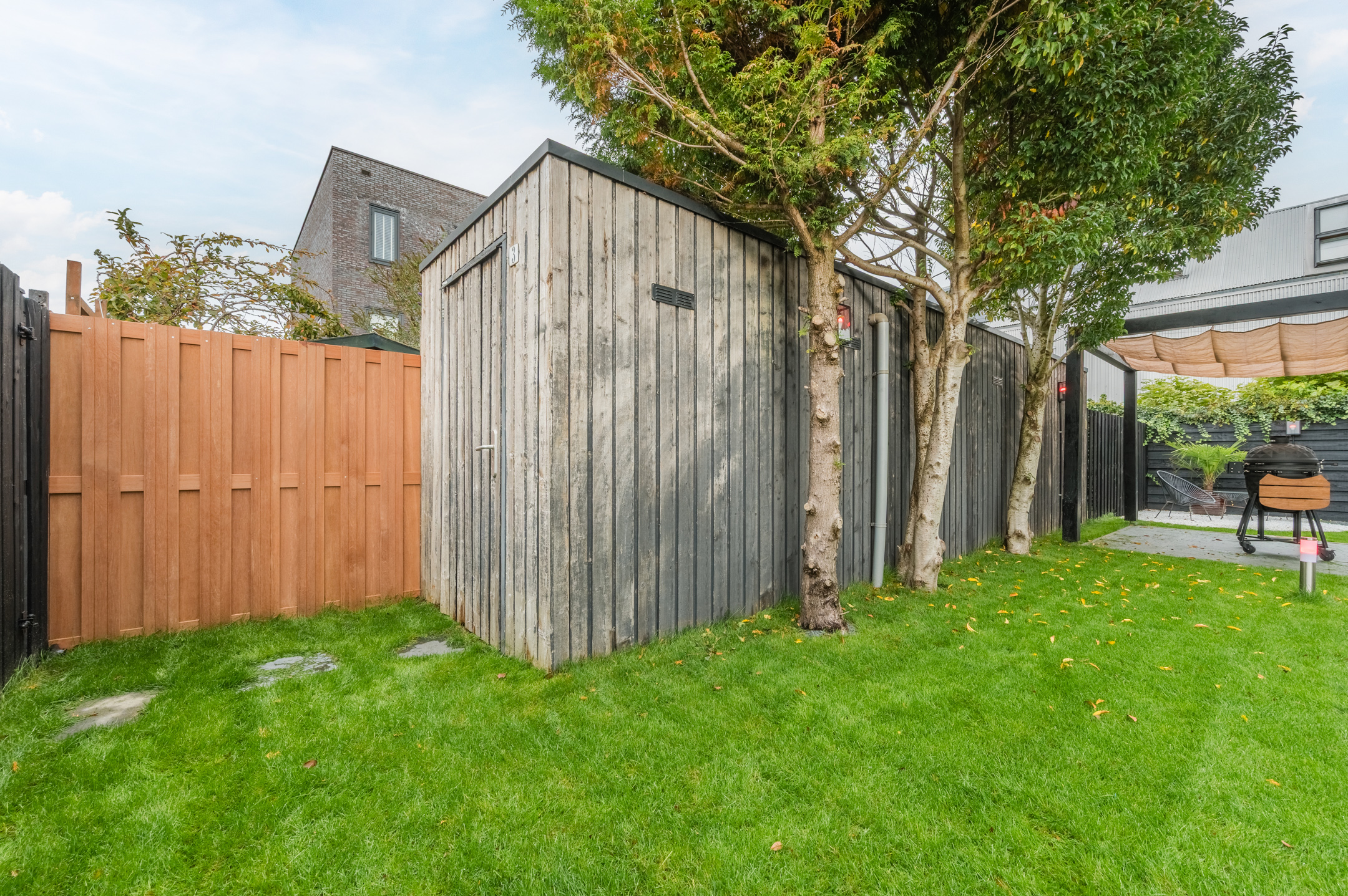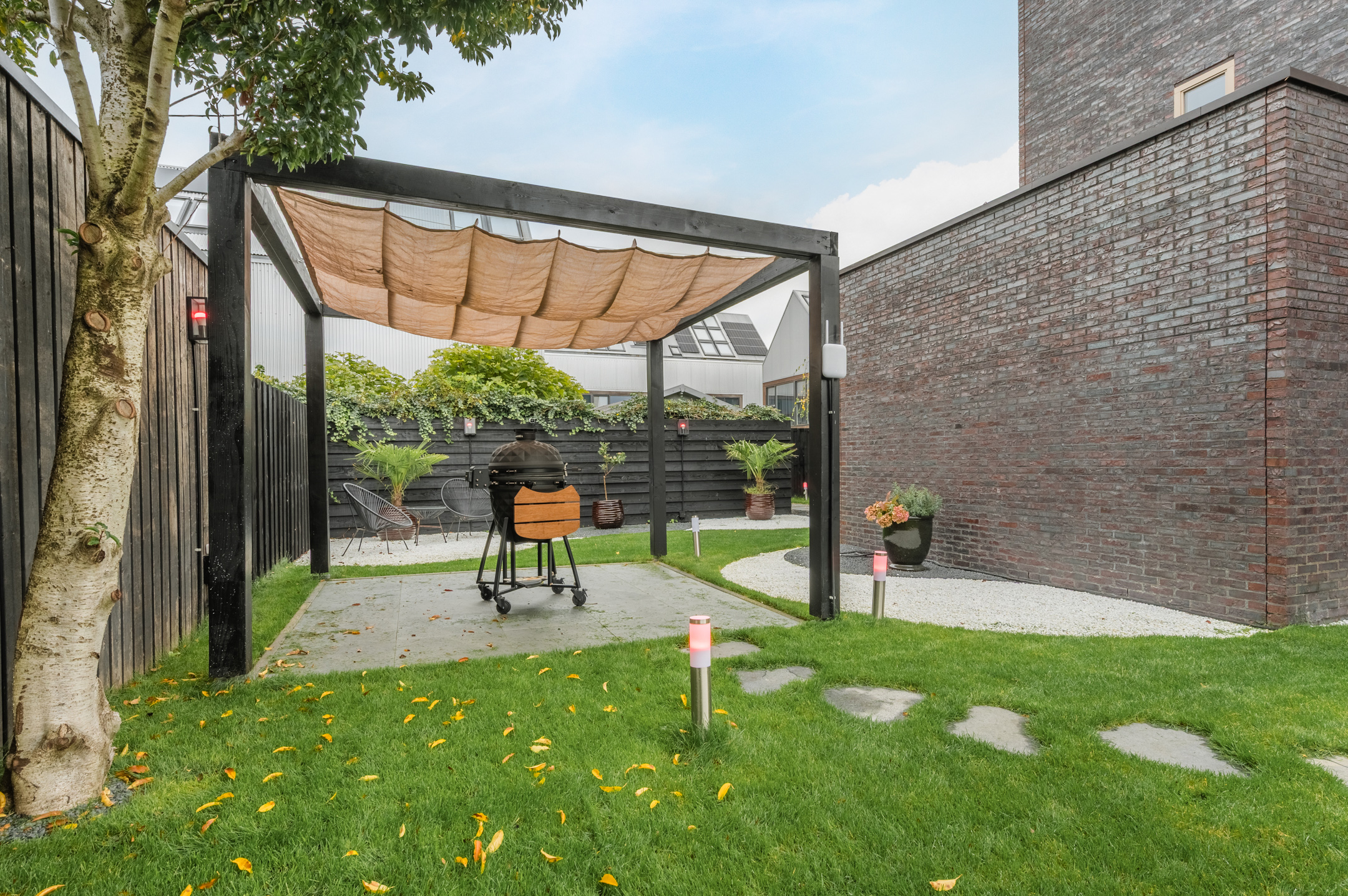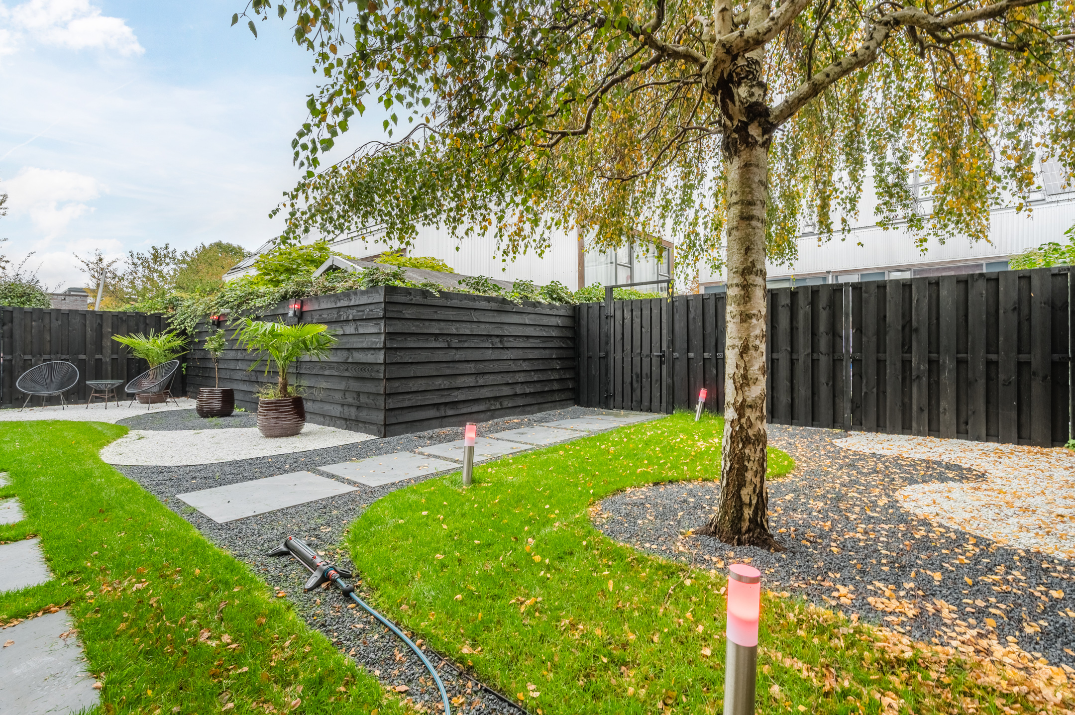 De woning beschikt over een beschutte en grote tuin op het zuidwesten die fraai is aangelegd met gebalanceerde mix van betegelde terrassen, groene borders, gras en bomen. Tevens is er een gezellige pergola met schaduwdoek gerealiseerd en staat er een handige houten berging op het eigen terrein.