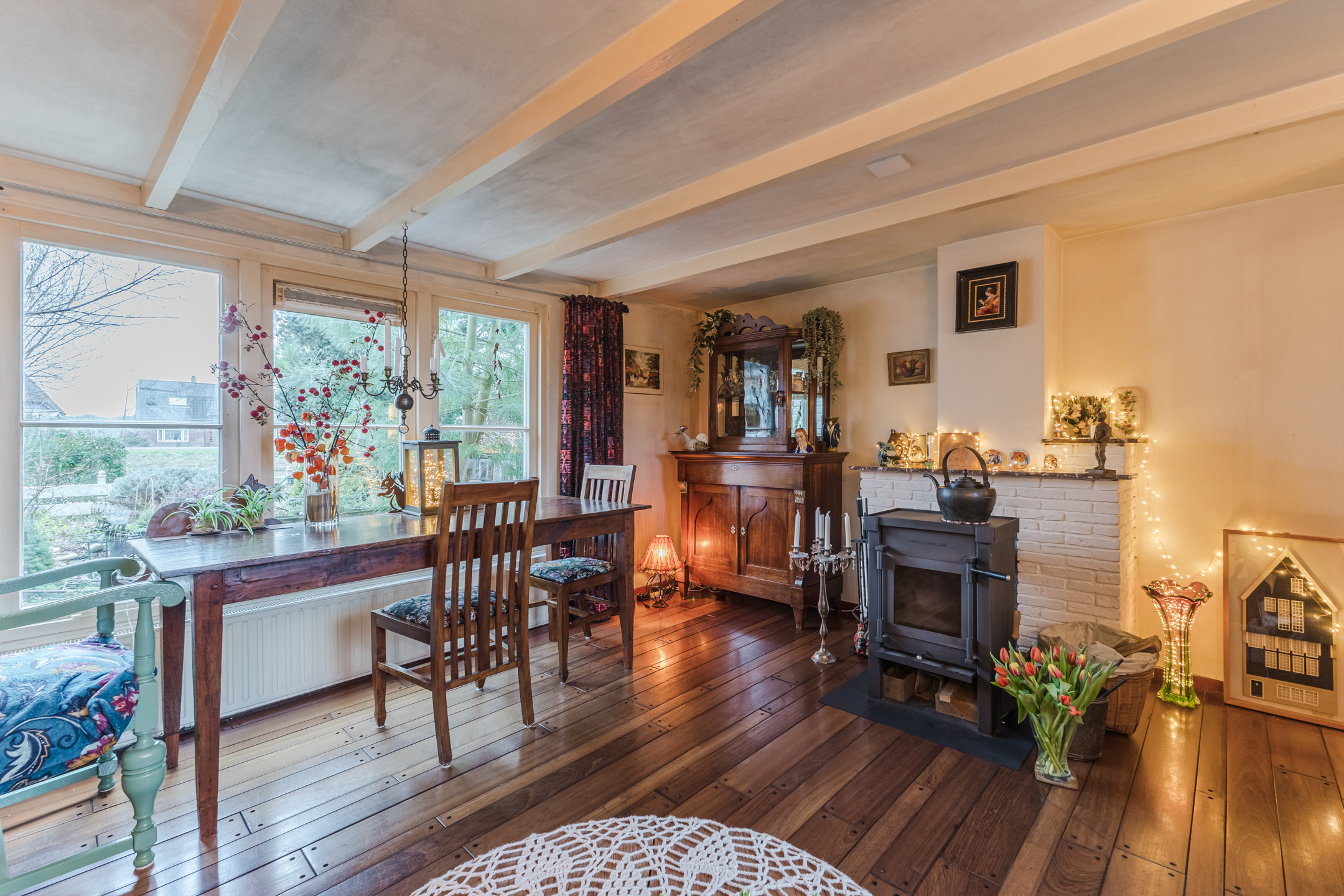 Via een open toog in de keuken heb je toegang tot een hal met trapopgang naar de eerste verdieping, toegang tot een separaat toilet, 2 slaapkamers en de woonkamer. De gezellige sfeervolle woonkamer heeft een houten vloer, schouw met aansluiting voor houtkachel, en balkenplafond.