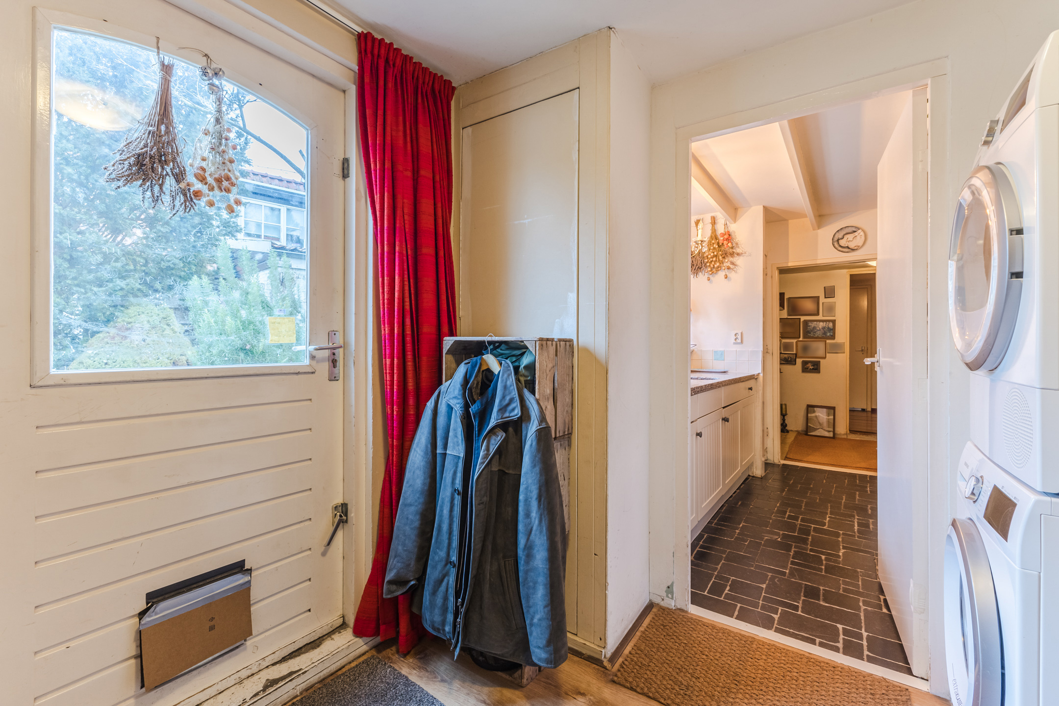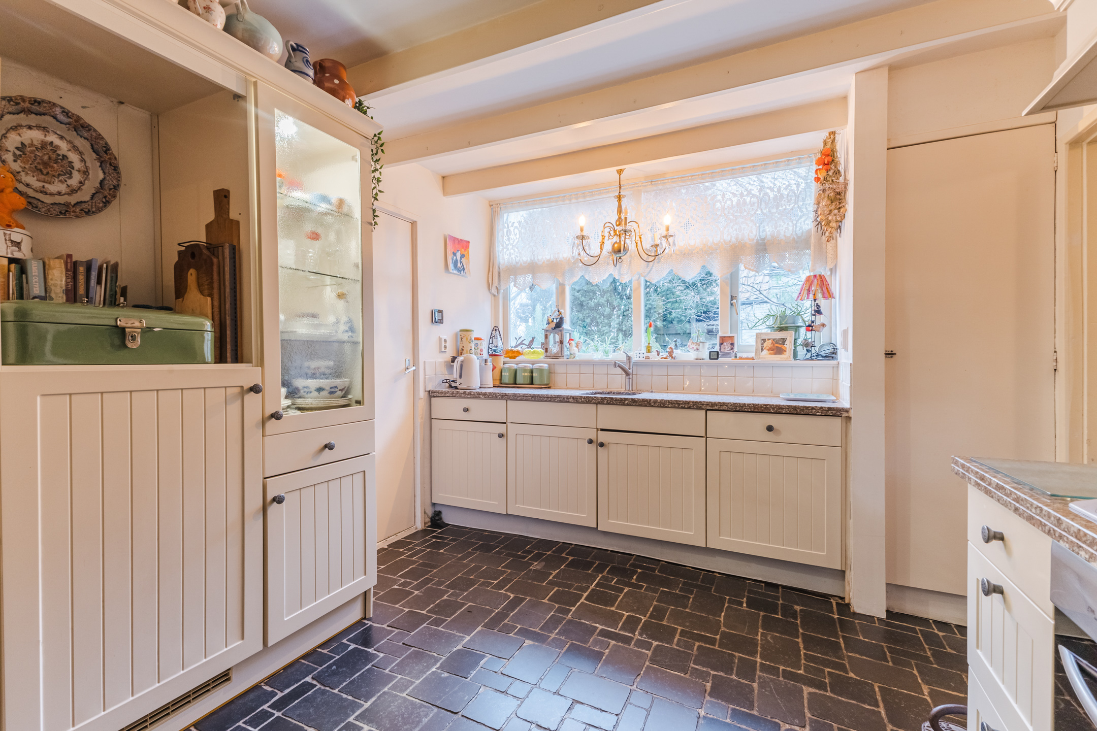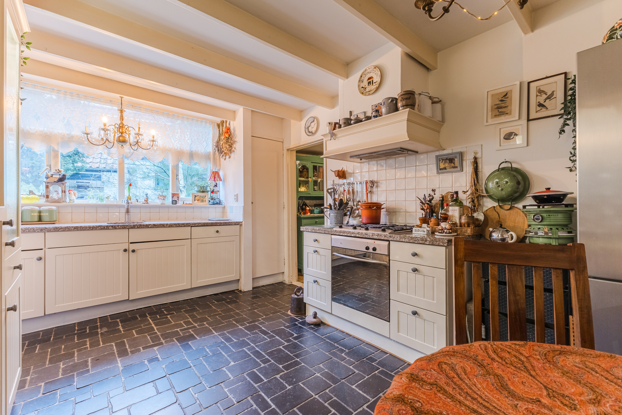 Ruime entree met toegang tot de keuken. De gezellige leefkeuken is een fijne open ruimte met een mooie tegelvloer, balkenplafond en grote ramen die uitzicht bieden over de tuin. De landelijke keuken is voorzien van een gaskookplaat en een elektrische oven, een vriezer en een vaatwasser. Vanuit de keuken is er toegang tot de badkamer met de wastafel met meubel, ligbad en inloopdouche. De badkamer is voorzien van vloerverwarming.