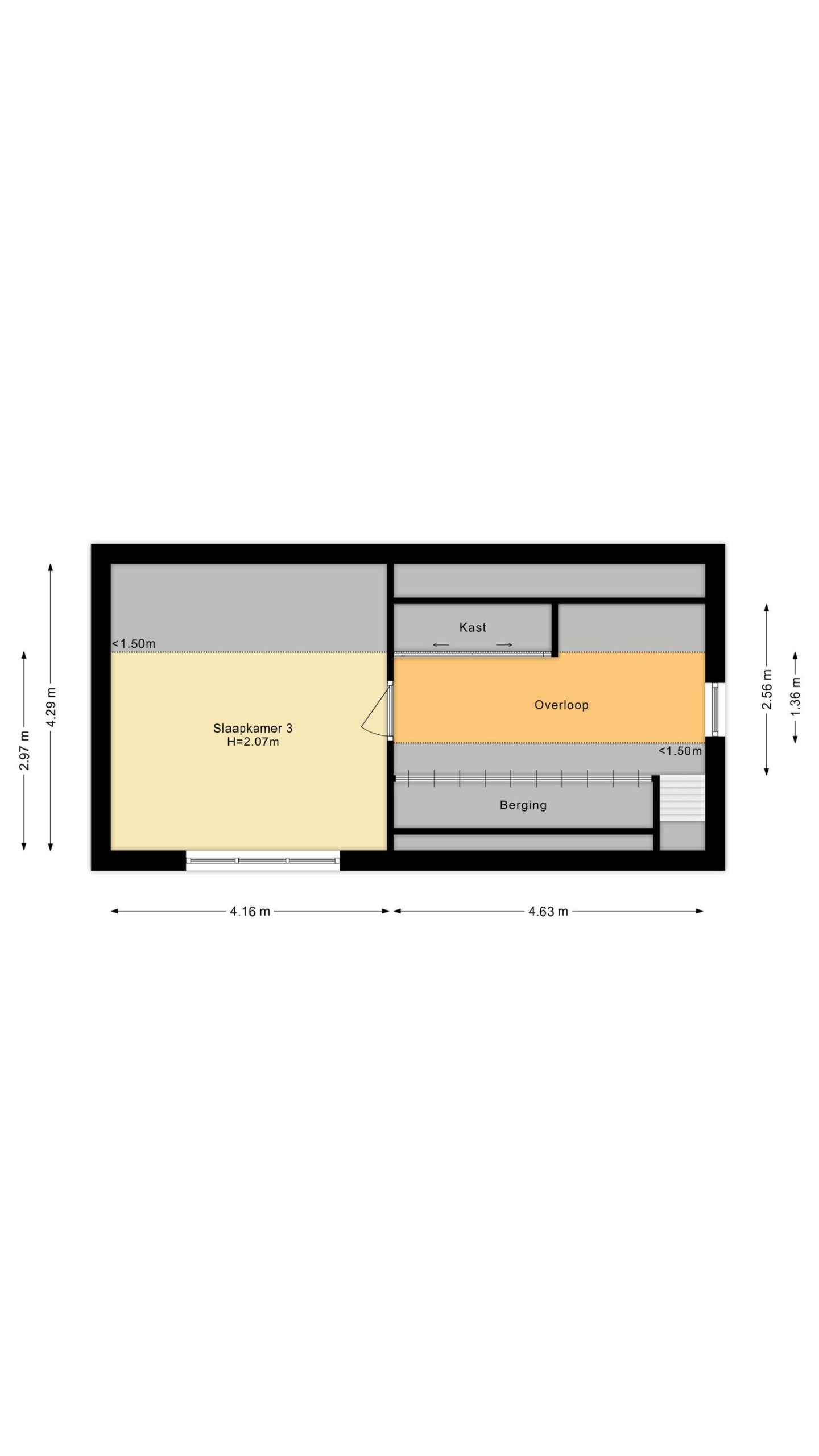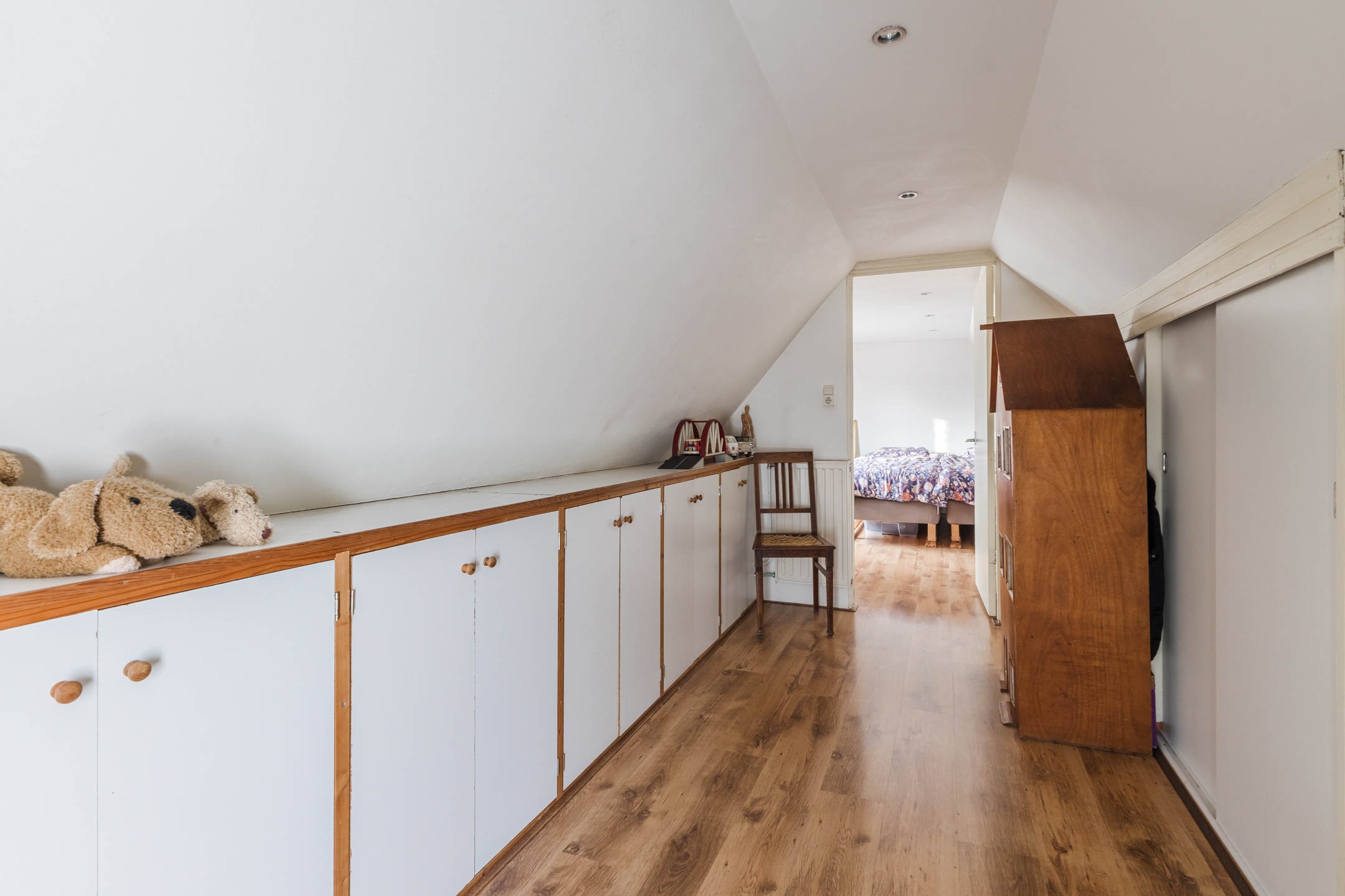 Overloop die toegang biedt tot de 3e slaapkamer. Tevens is er een aparte vlieringzolder met extra opslagruimte aanwezig boven de aanbouw.