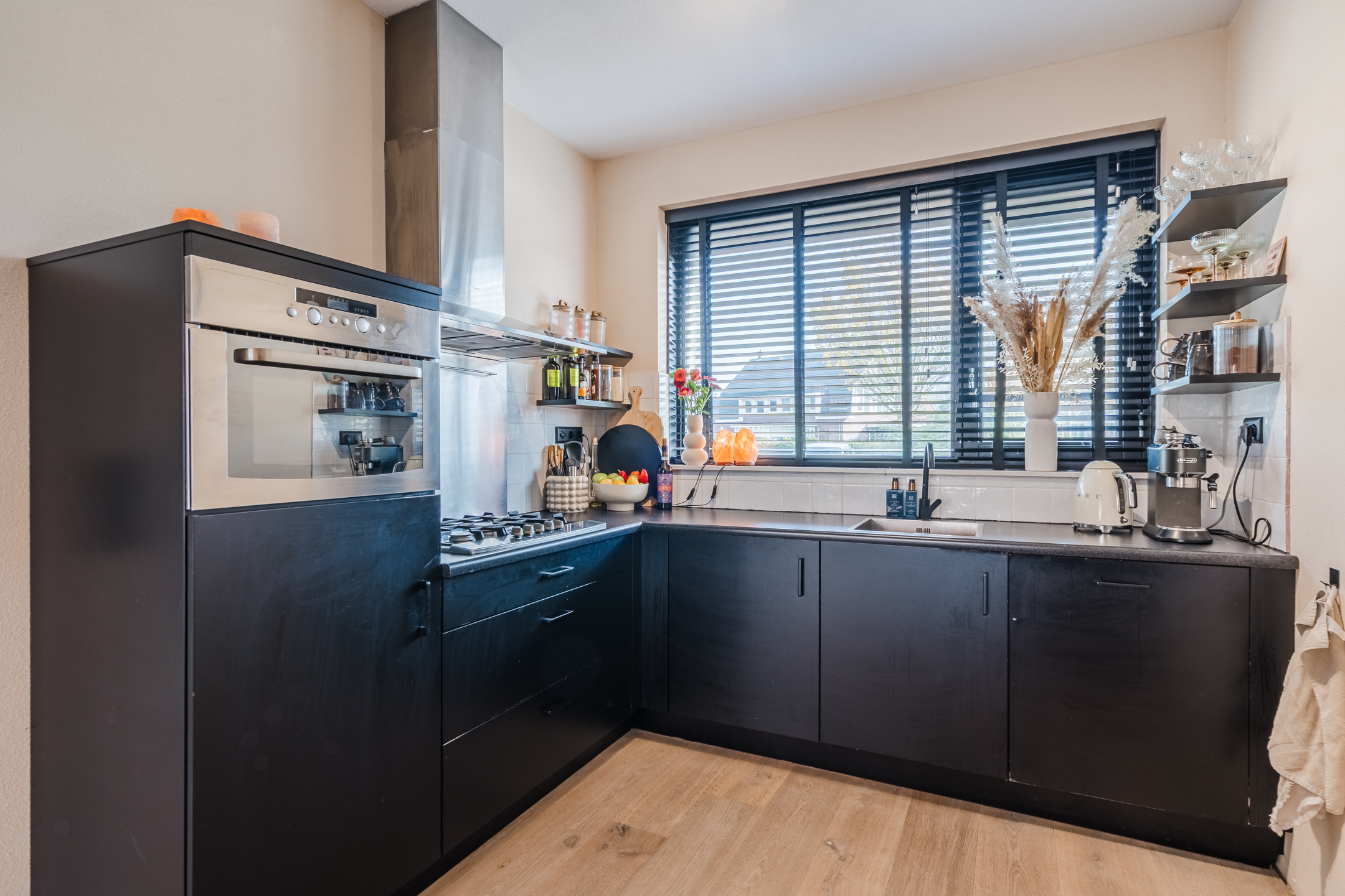 Een prachtige glazen tussendeur biedt vanuit de entree toegang tot het woongedeelte. Hier vind je aan de voorkant een de keuken in hoekopstelling, met inbouwapparatuur als een vaatwasser, gasfornuis, koelkast en combimagnetron.