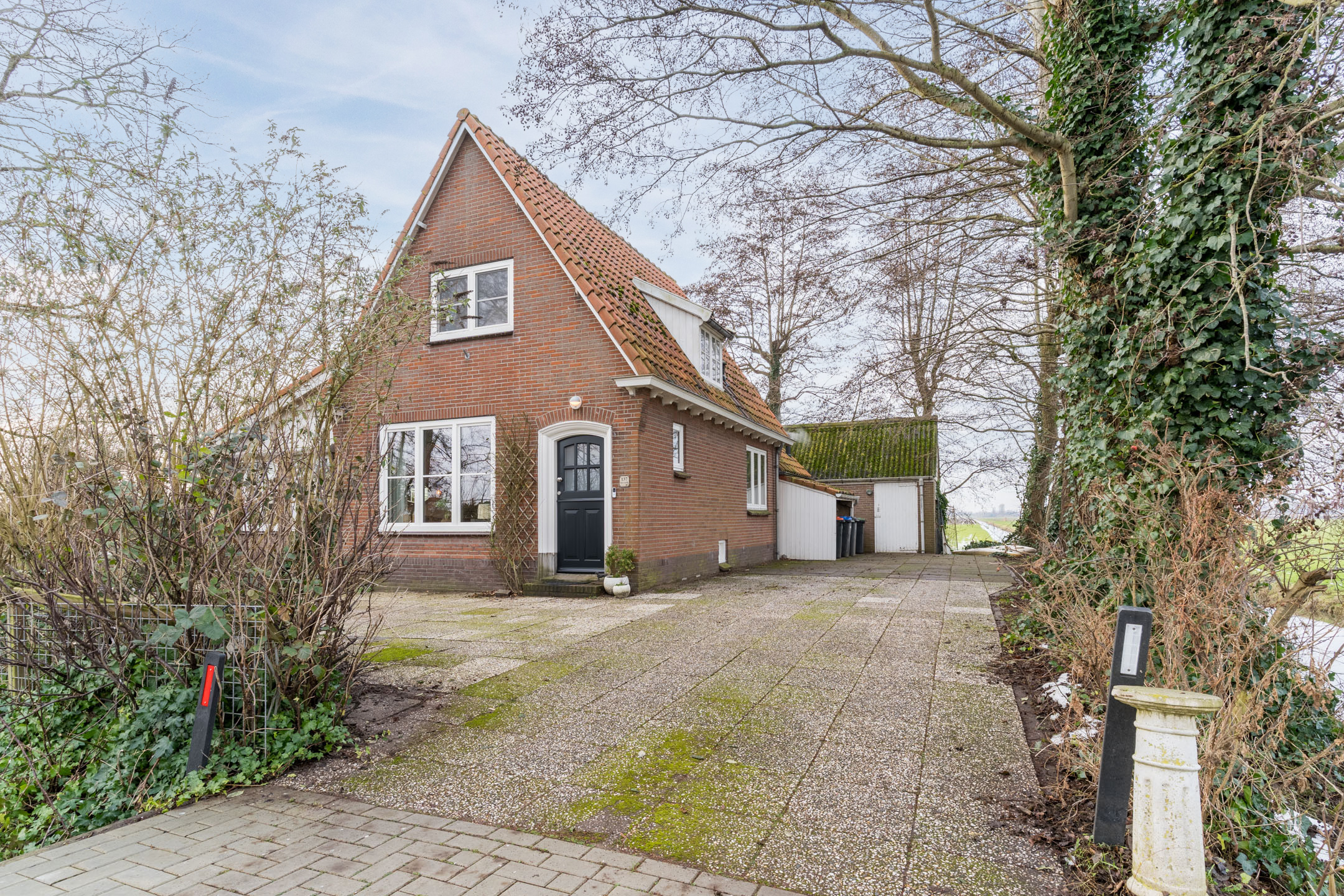 Via de lange oprijlaan op eigen terrein, bereiken we de voordeur van de woning.