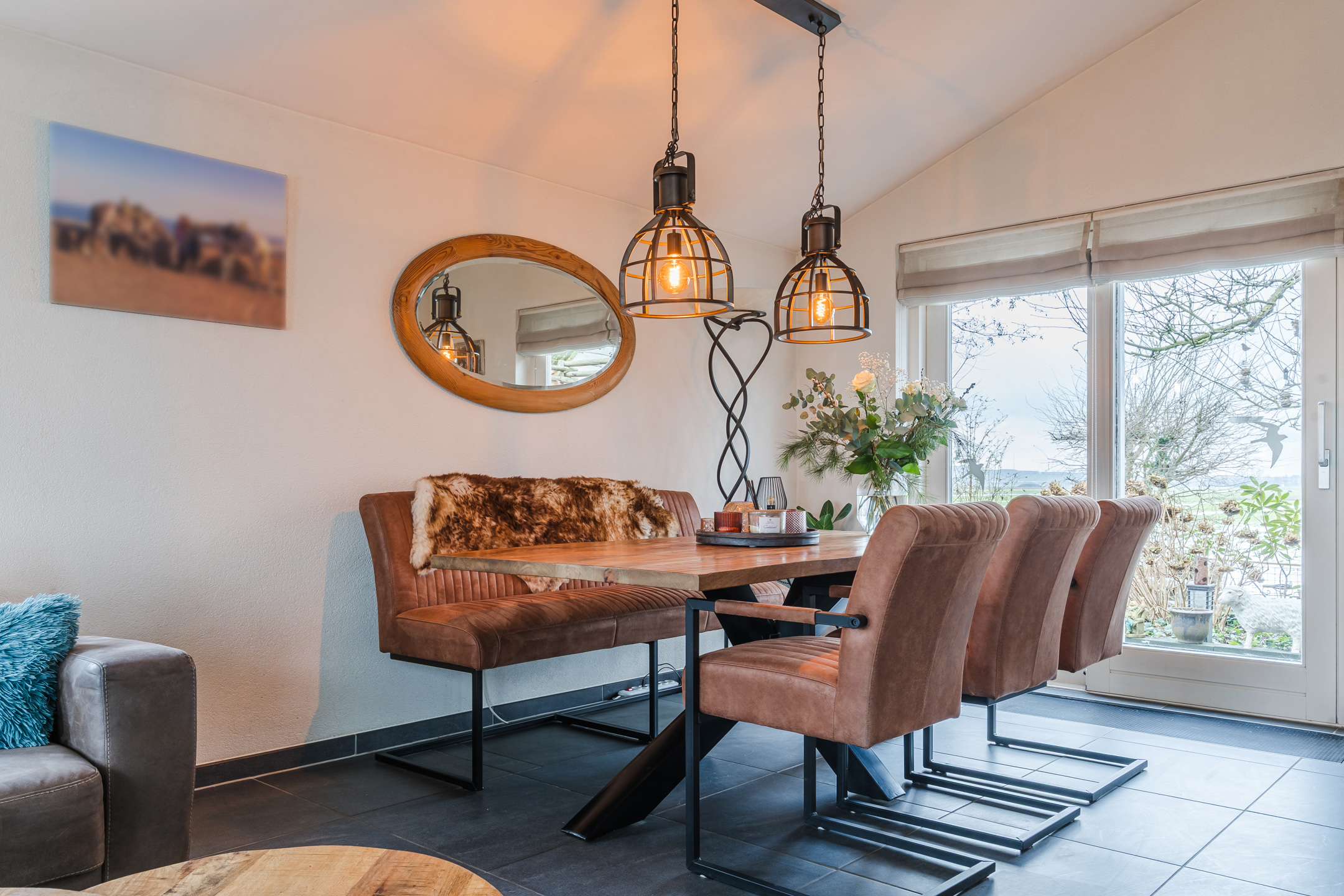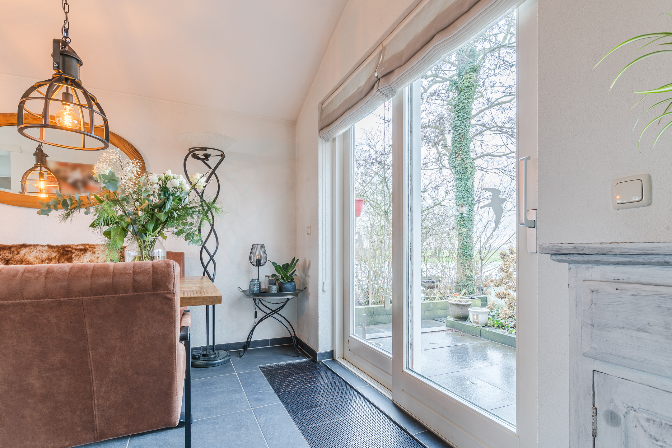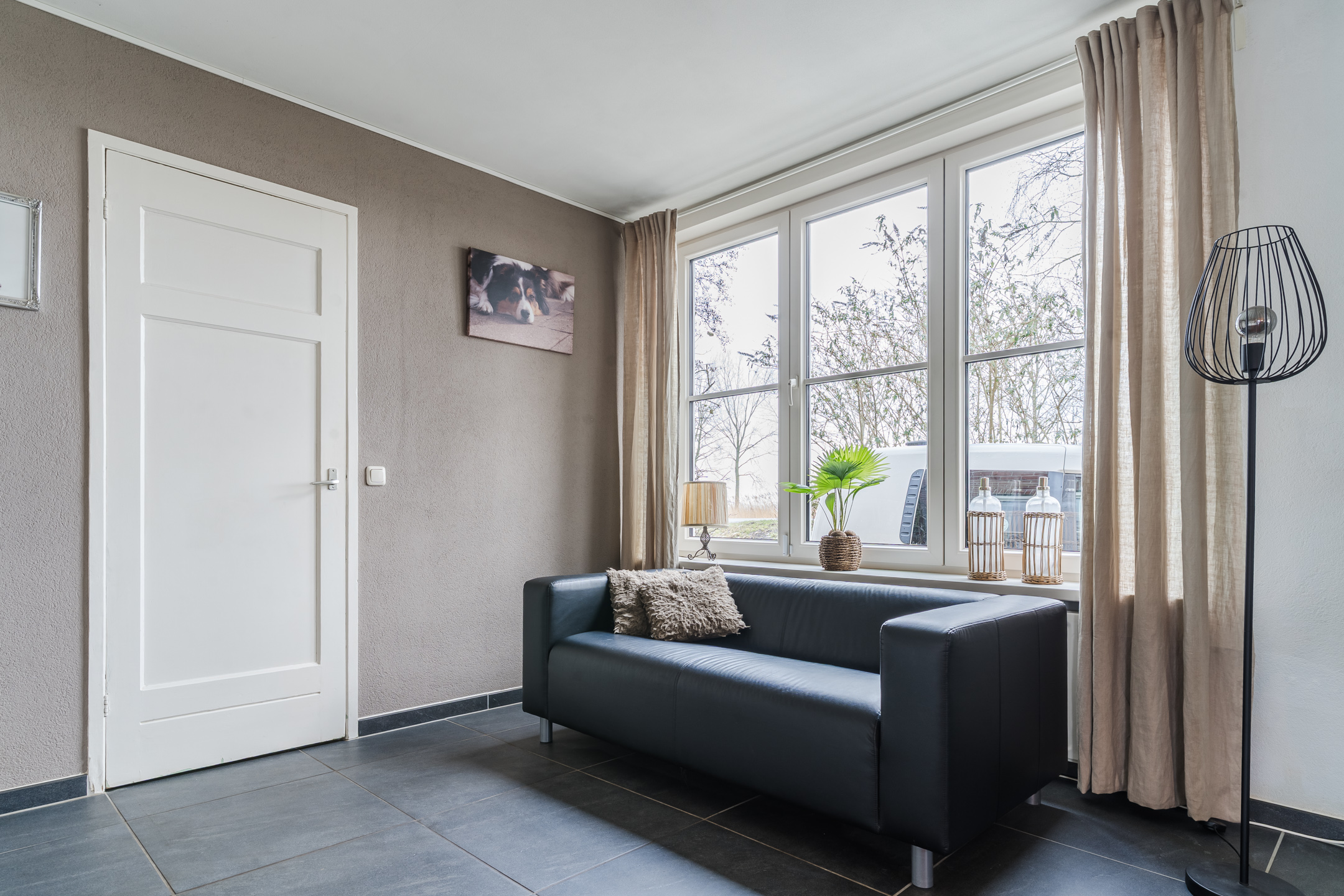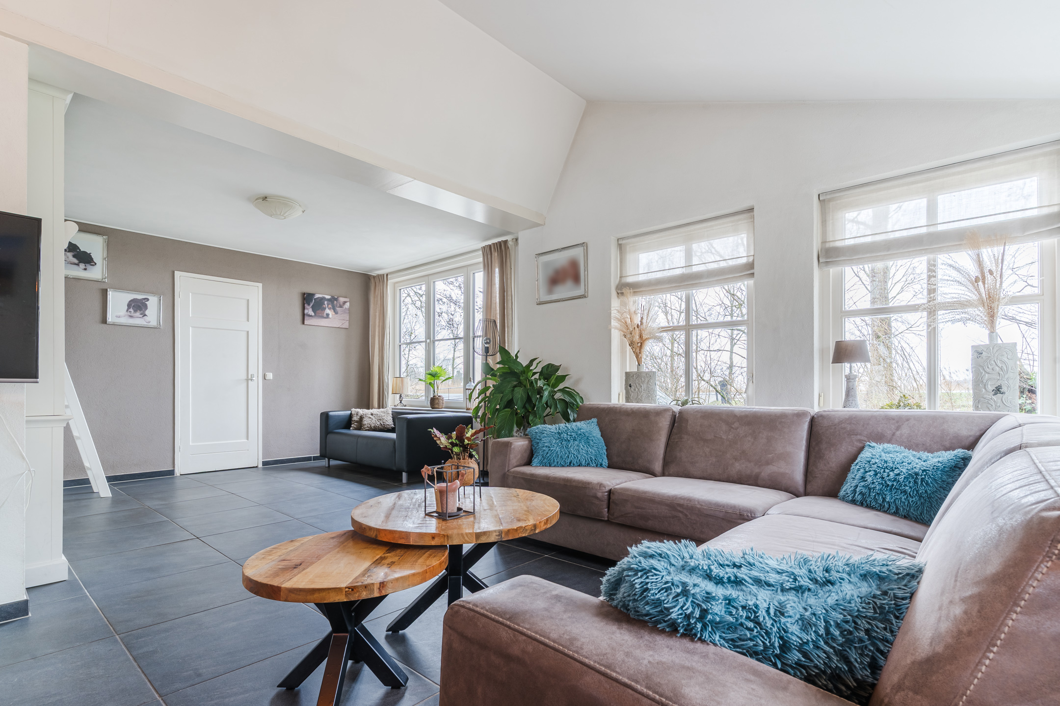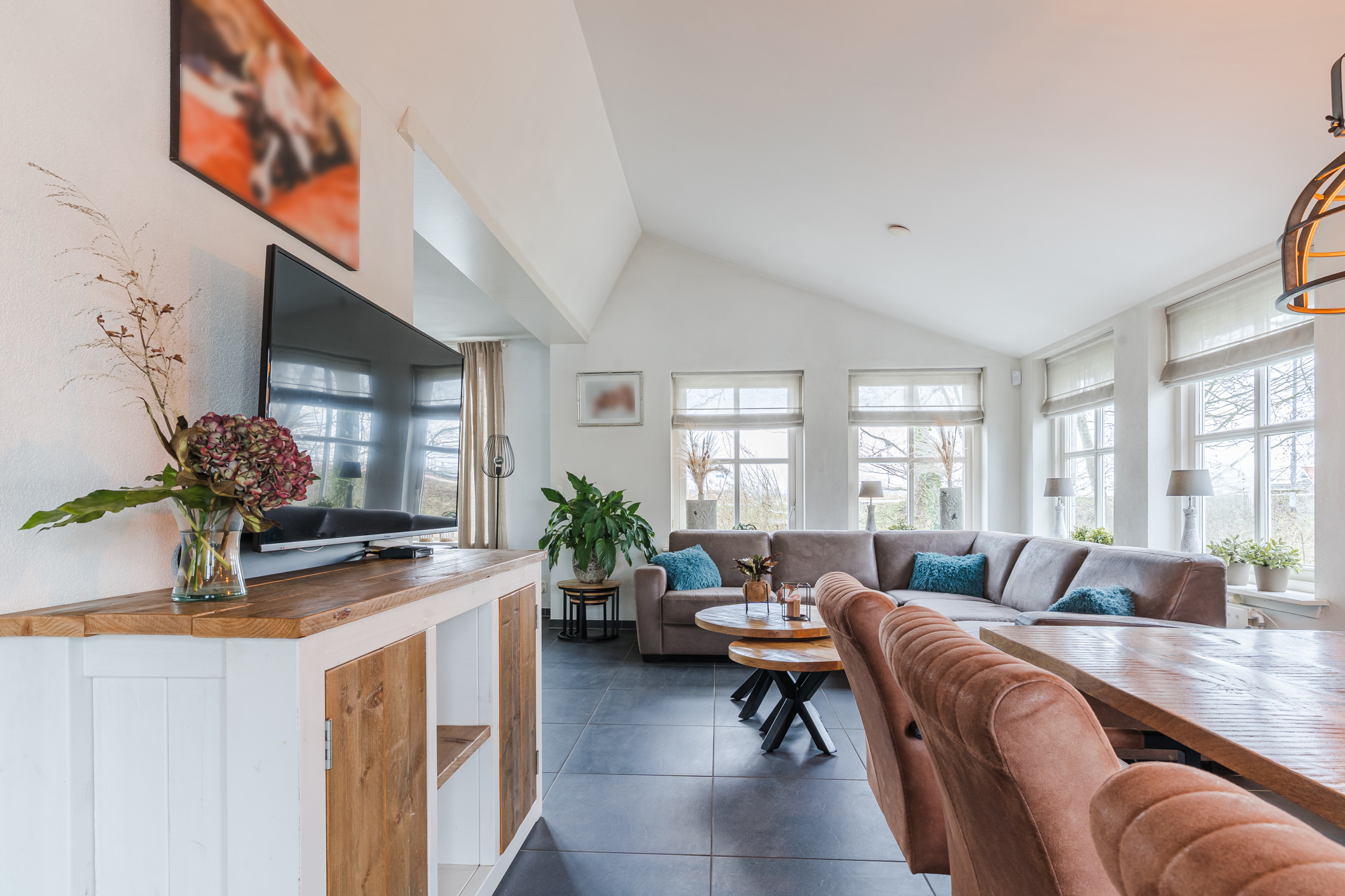 De royale woonkamer geniet door de vele raampartijen van een grote hoeveelheid lichtinval en is fraai afgewerkt met een tegelvloer en gedeeltelijke elektrische vloerverwarming.