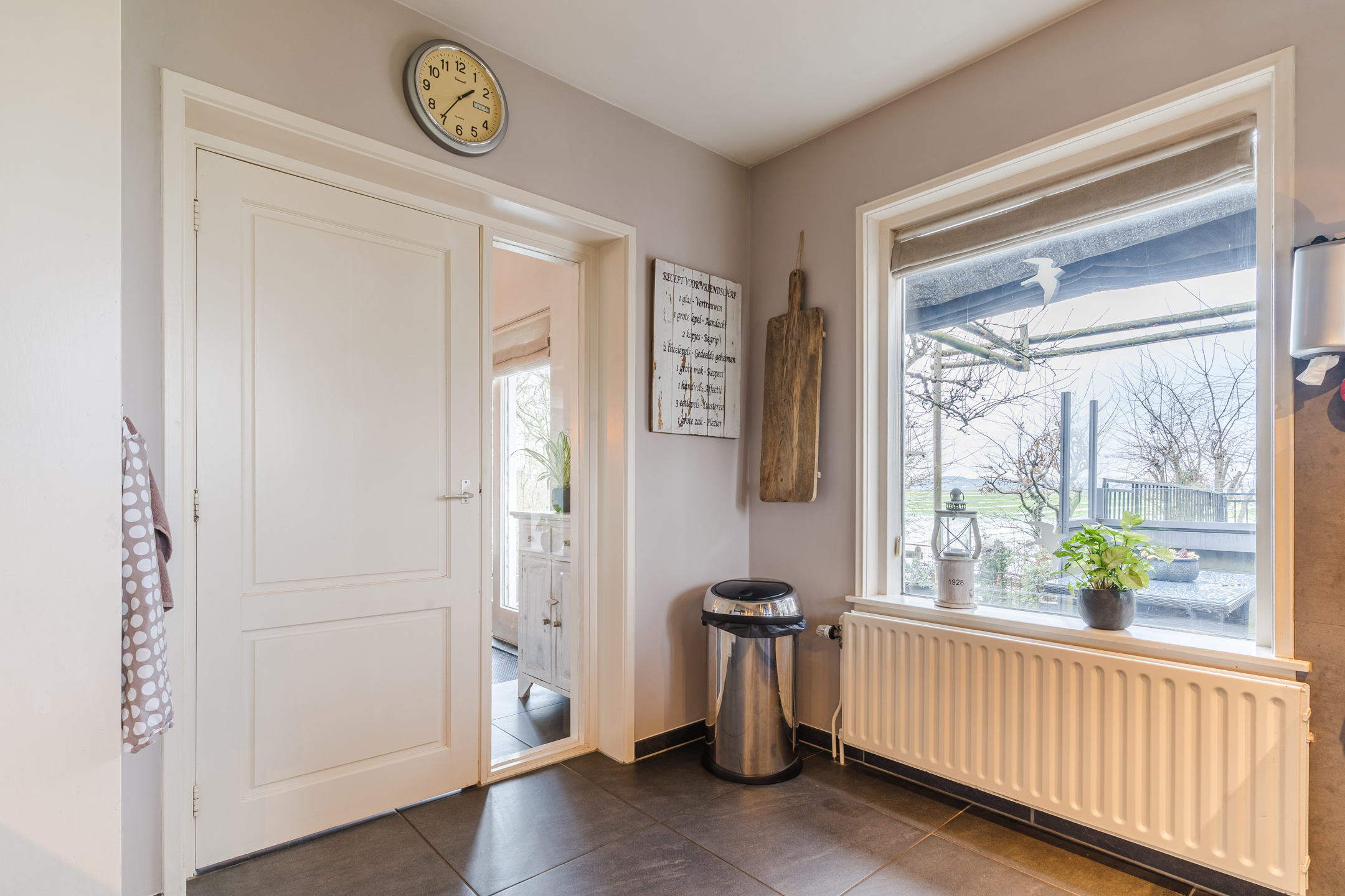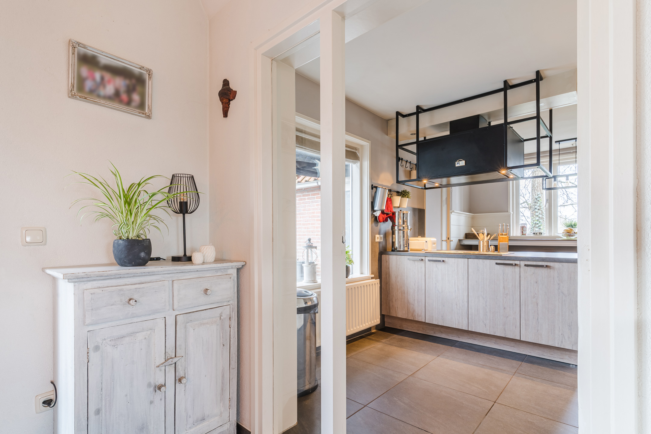 Achter de vernieuwde en geĆÆsoleerde voordeur vinden we de ruime entreehal met de garderobe, meterkast, trapopgang naar de eerste verdieping en de toegang tot zowel de woonkamer als tot de half-open leefkeuken.