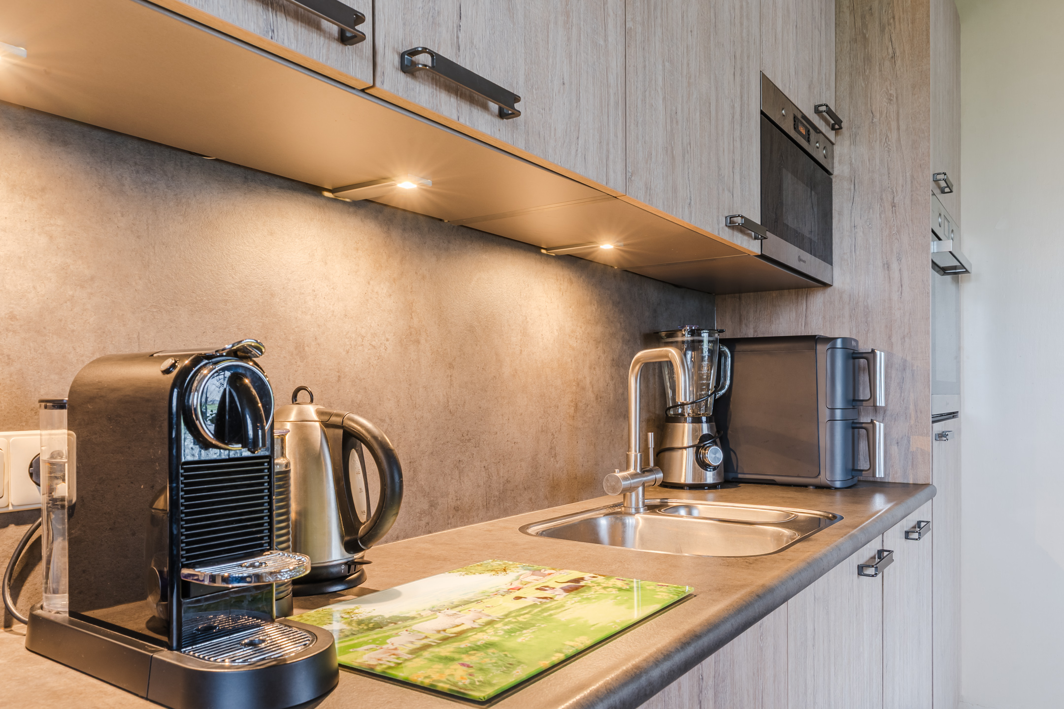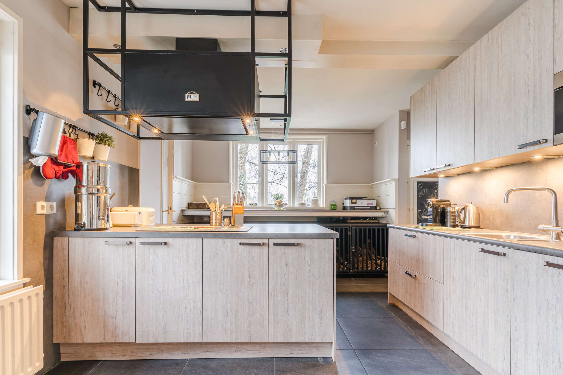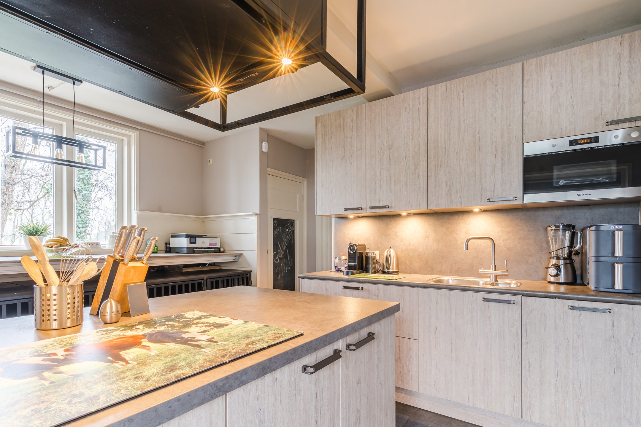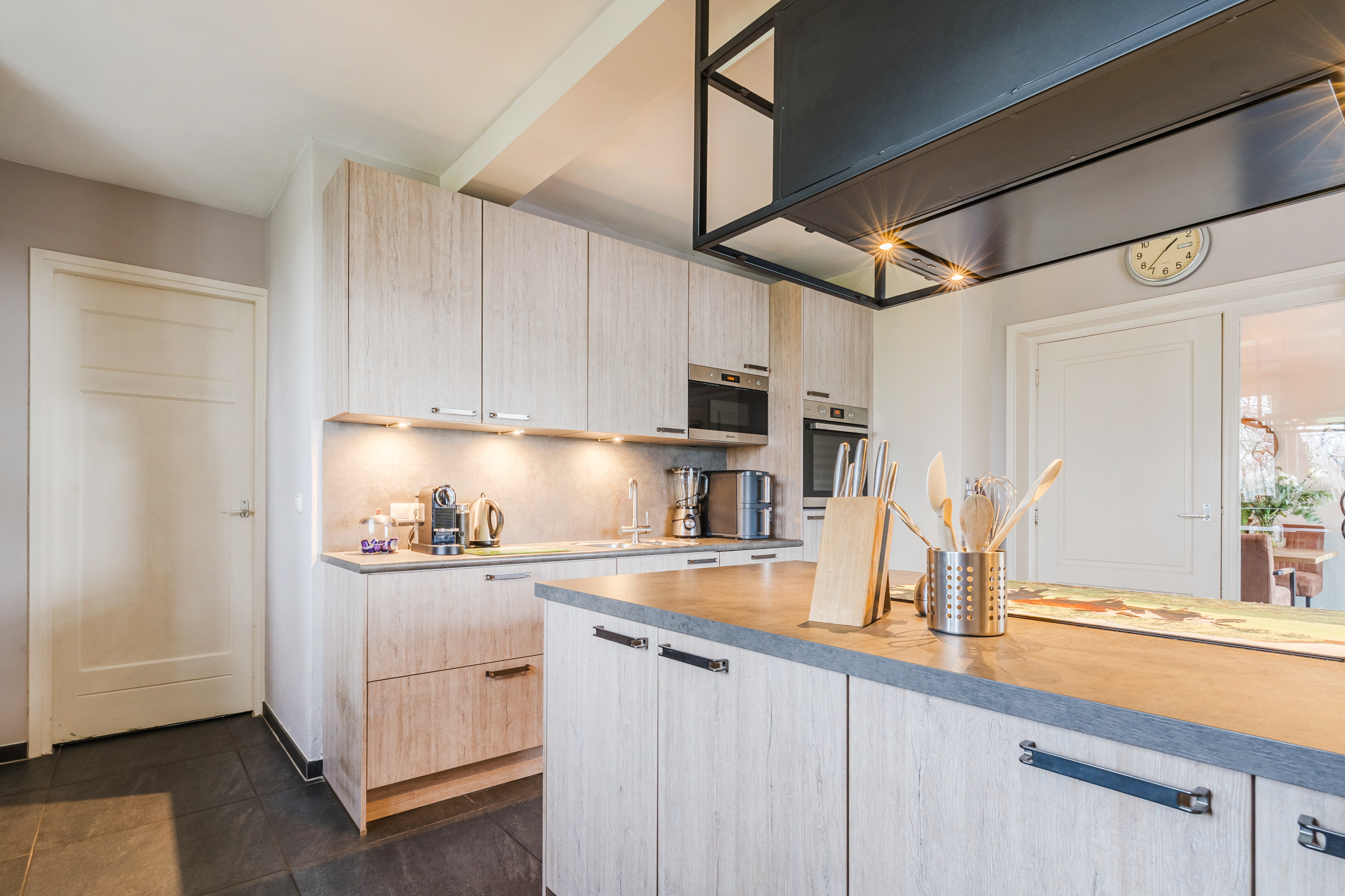 De ruime leefkeuken met kookeiland is heerlijk ruim en voorzien van moderne apparatuur: een inductiekookplaat, oven, stoomoven, magnetron, koelkast, vriezer en een vaatwasser.