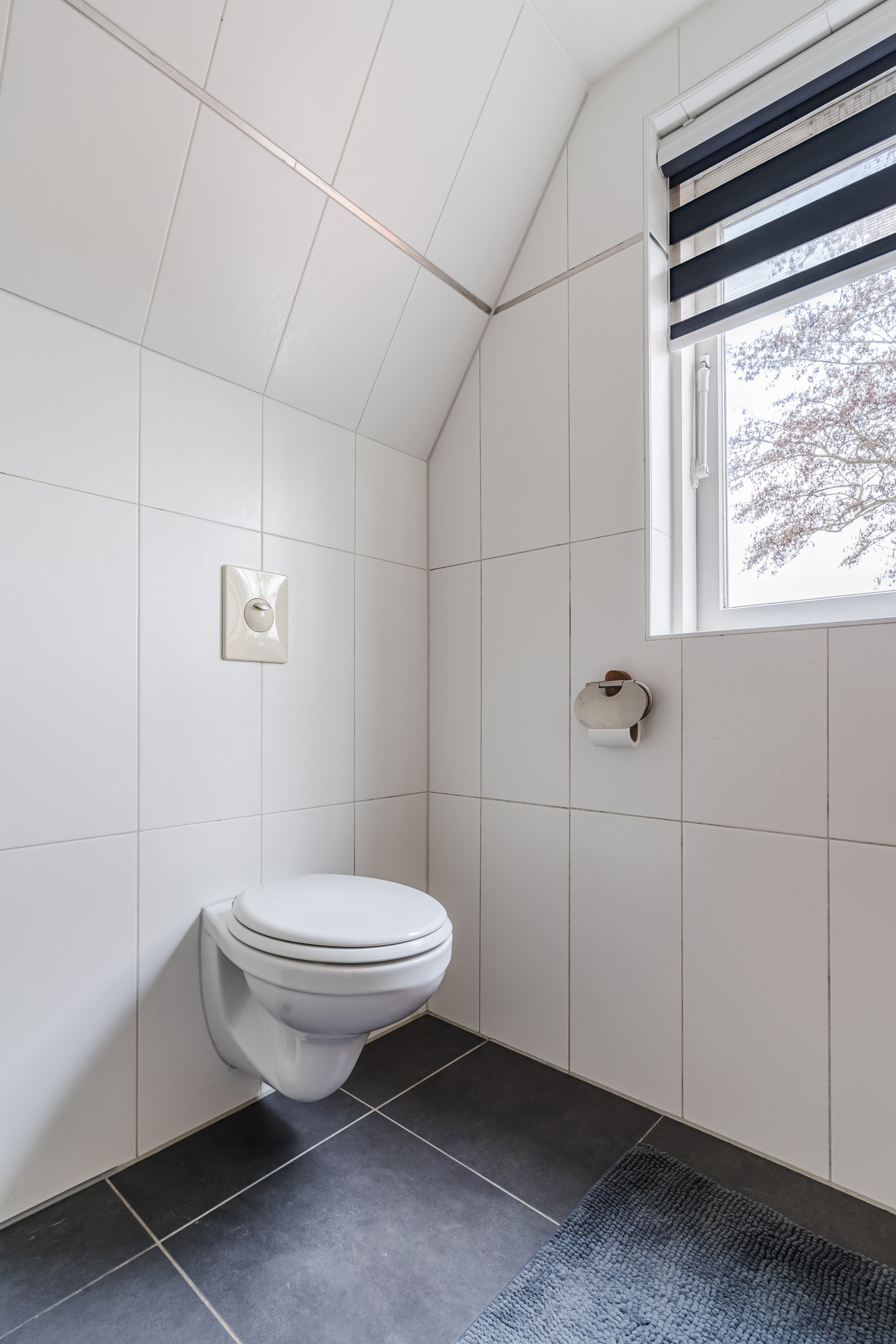 The landing provides access to two bedrooms and the bathroom. Both bedrooms are neatly finished with laminate flooring and have built-in wardrobes. The master bedroom boasts a beautiful high ceiling with exposed beams, giving the space a wonderful ambiance. The modern bathroom is equipped with recessed lighting, a second toilet, a vanity unit, and a walk-in shower.